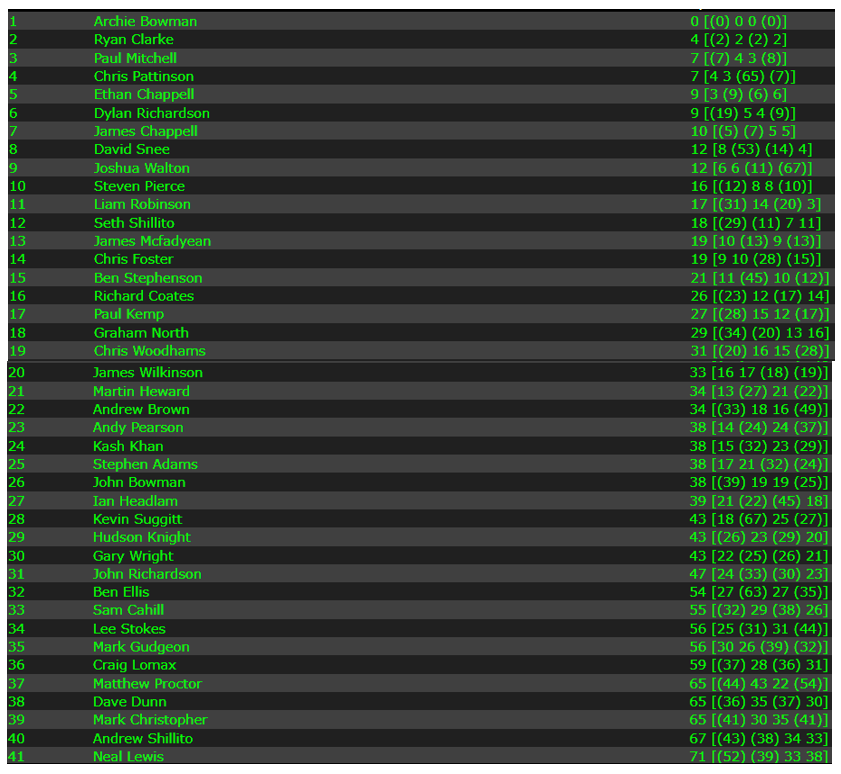 Also in this round, top grafter Andy Kindon banking a 36 to go with his 38, top stuff at regional level, and Neal Lewis, Mark Christopher and Craig Lomax, all improving by ~10 positions in this round, - comeback kid Richard Coates going 12th in round (hasn't lost it) as the local knowledge started to wear off, and the visitors got into the track.